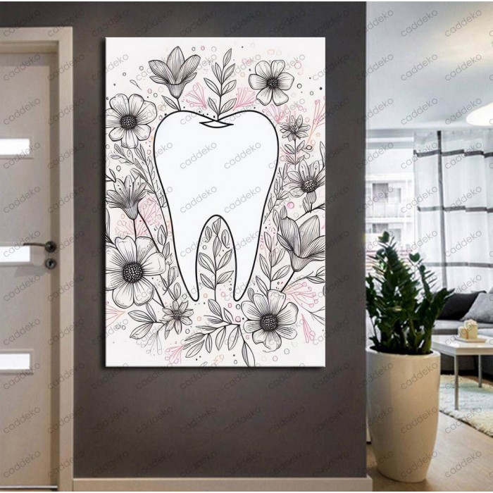 Ağız ve Diş Sağlığı Poliklinikleri ve diş hastanelerinde hastaların daha güzel ve hoş bir ortamda ağarlanması için özel tasarım çene bölgesinde beyaz ve doğal dişleri kaplayan floral çiçek desenleri ile duvar dekorasyonunuzu renklendirip canlandıracak, birbirinden güzel ağız, diş, çene ve dişçi konulu tablolar.