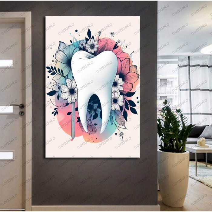 Ağız ve Diş Sağlığı Poliklinikleri ve diş hastanelerinde hastaların daha güzel ve hoş bir ortamda ağarlanması için özel tasarım çene bölgesinde beyaz ve doğal dişleri kaplayan floral çiçek  desenleri ile  duvar dekorasyonunuzu renklendirip canlandıracak, birbirinden güzel ağız, diş, çene ve dişçi konulu tablolar.