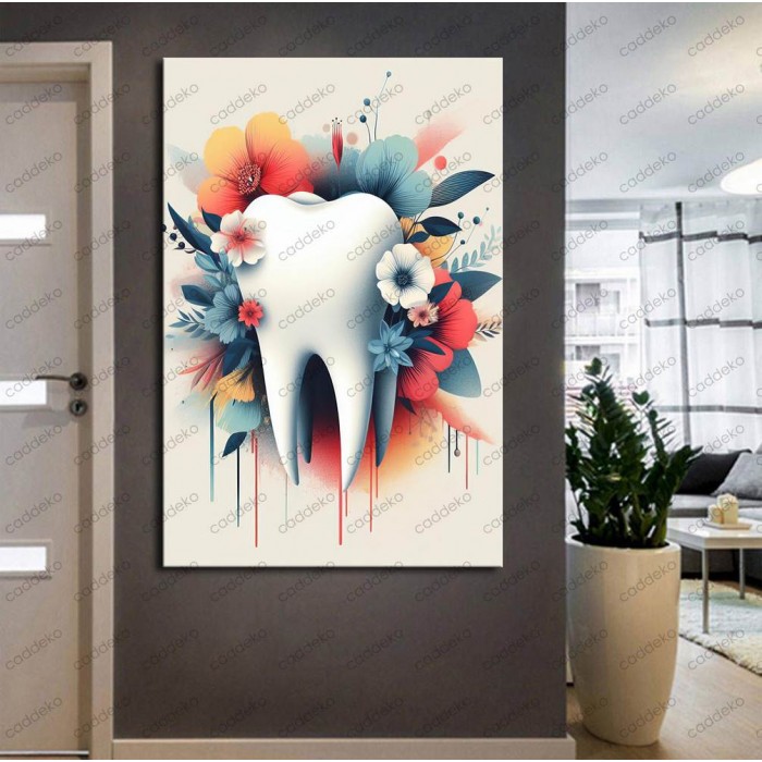 Ağız ve Diş Sağlığı Poliklinikleri ve diş hastanelerinde hastaların daha güzel ve hoş bir ortamda ağarlanması için özel tasarım çene bölgesinde beyaz ve doğal dişleri kaplayan floral çiçek  desenleri ile  duvar dekorasyonunuzu renklendirip canlandıracak, birbirinden güzel ağız, diş, çene ve dişçi konulu tablolar.