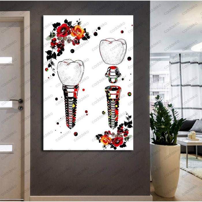 Ağız ve Diş Sağlığı Poliklinikleri ve diş hastanelerinde hastaların daha güzel ve hoş bir ortamda ağarlanması için,  beyaz fon üzerine tasarımı tamamlayan çiçekler kelebekler ve renkli implant diş. Duvar dekorasyonunuzu renklendirip canlandıracak, birbirinden güzel ağız, diş, çene ve dişçi konulu tablolar.