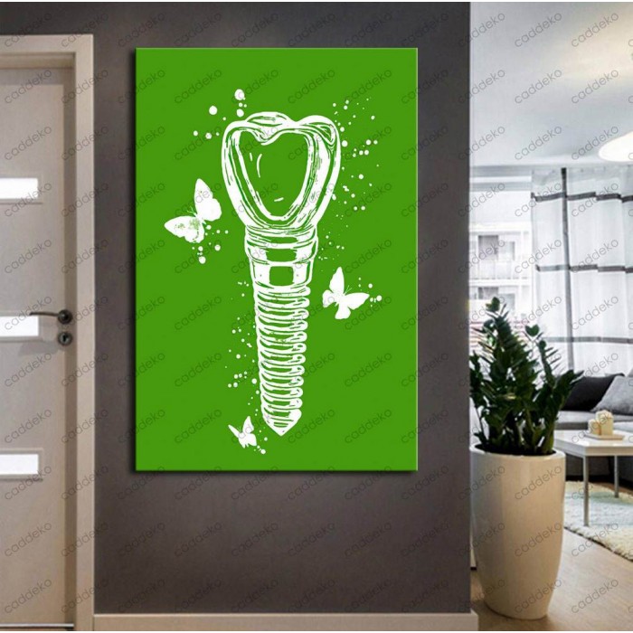 Ağız ve Diş Sağlığı Poliklinikleri ve diş hastanelerinde hastaların daha güzel ve hoş bir ortamda ağarlanması için,  yeşil fon üzerine tasarımı tamamlayan beyaz implant diş. Duvar dekorasyonunuzu renklendirip canlandıracak, birbirinden güzel ağız, diş, çene ve dişçi konulu tablolar.