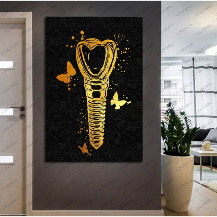 Ağız ve Diş Sağlığı Poliklinikleri ve diş hastanelerinde hastaların daha güzel ve hoş bir ortamda ağarlanması için, özel tasarım bu tablomuzda siyah fon üstüne altın rengi ile bezenmiş diş implantı ve kelebekler. Duvar dekorasyonunuzu renklendirip canlandıracak, birbirinden güzel ağız, diş, çene ve dişçi konulu tablolar Dekomani'den.