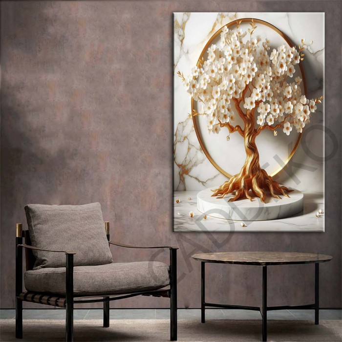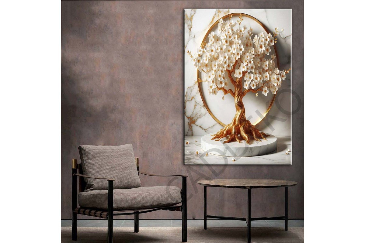 Beyaz Uzakdoğu Çiçekleri Gold Dekoratif Kanvas Tablo dkmr439