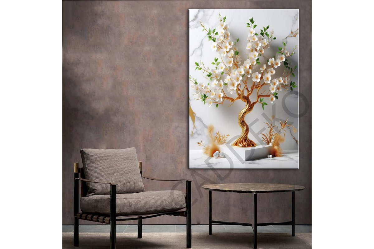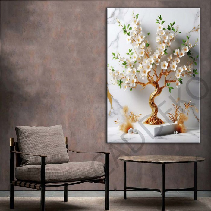 Beyaz Yeşil Uzakdoğu Çiçekleri Gold Dekoratif Kanvas Tablo dkmr440