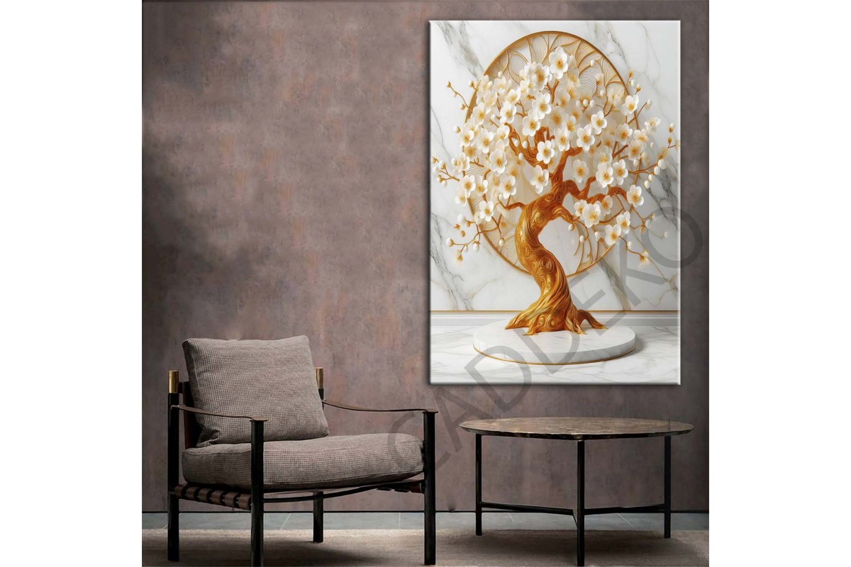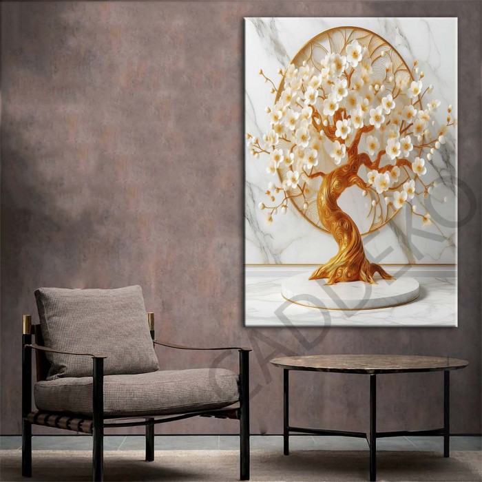 Beyaz Uzakdoğu Çiçekleri Gold 5 Dekoratif Kanvas Tablo dkmr447