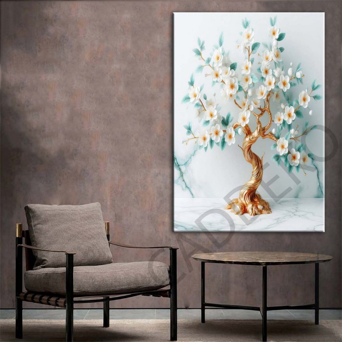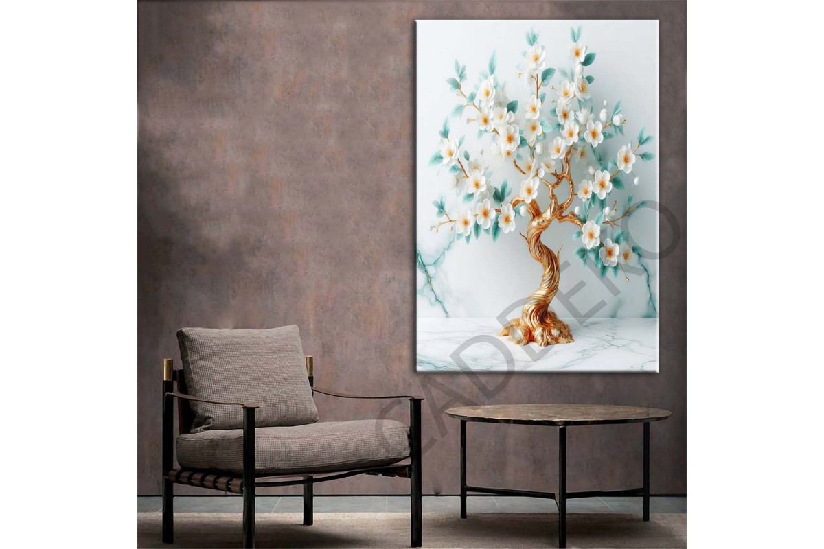 Beyaz Turkuvaz Uzakdoğu Çiçekleri Gold 3 Dekoratif Kanvas Tablo dkmr452