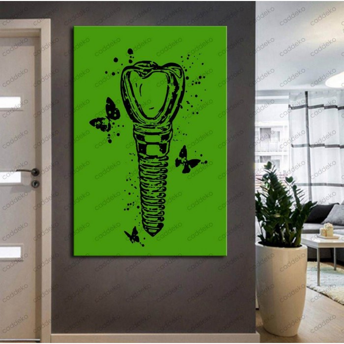 Ağız ve Diş Sağlığı Poliklinikleri ve diş hastanelerinde hastaların daha güzel ve hoş bir ortamda ağarlanması için, yeşil fon üzerine tasarımı tamamlayan siyah implant diş. Duvar dekorasyonunuzu renklendirip canlandıracak, birbirinden güzel ağız, diş, çene ve dişçi konulu tablolar.