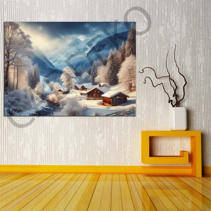 Kış, kar ve Kasaba Manzara Yağlı Boya Görünüm Kanvas Tablo dkmr397