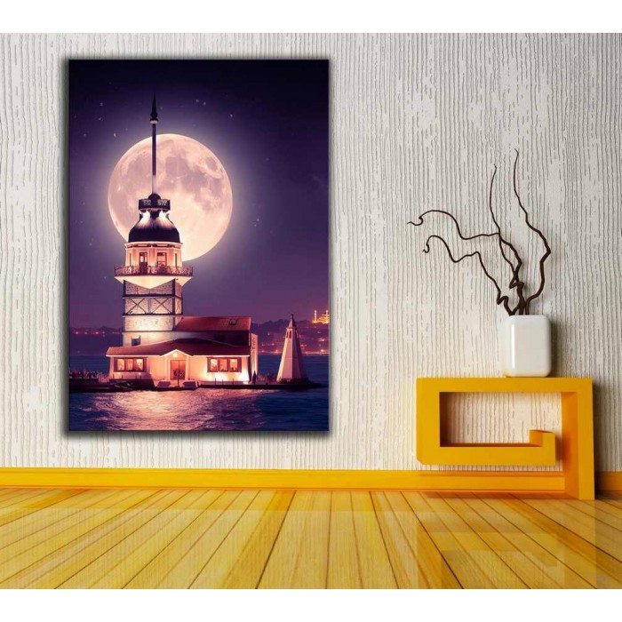 Kız Kulesi Kulesi ve Dolunay'da İstanbul Fantastik Masalsı Gece Kanvas Tablo dkmr287