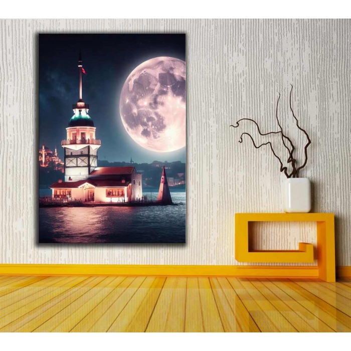 Kız Kulesi Kulesi ve Dolunay'da İstanbul Fantastik Masalsı Gece Kanvas Tablo dkmr288