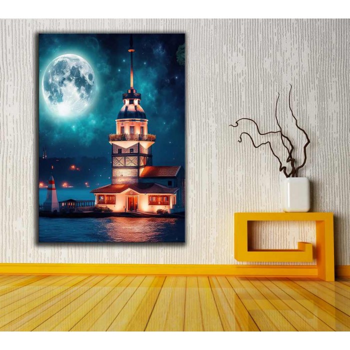 Kız Kulesi Kulesi ve Dolunay'da İstanbul Fantastik Masalsı Gece Kanvas Tablo dkmr289
